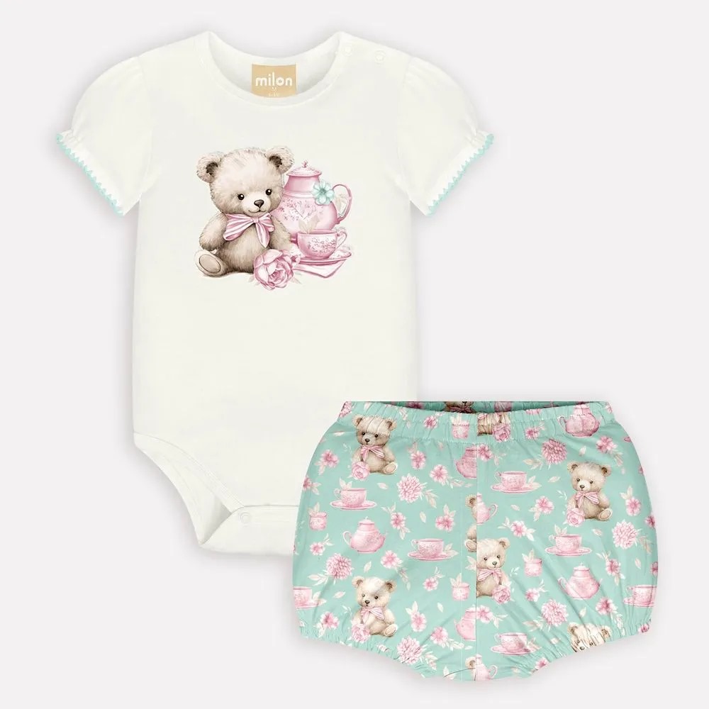 A blusa apresenta estampa localizada de ursinho, com decote redondo em debrum e abertura no ombro com botão, facilitando na hora da troca. As mangas curtas franzidas com detalhe decorativo na barra adicionam charme ao visual. O fechamento entrepernas com botões garante segurança e praticidade.