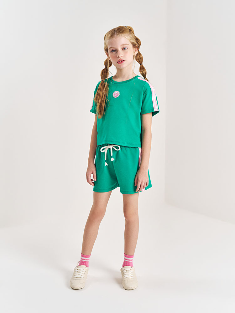 O shorts possui cós ajustável por cordão e listras laterais combinando.