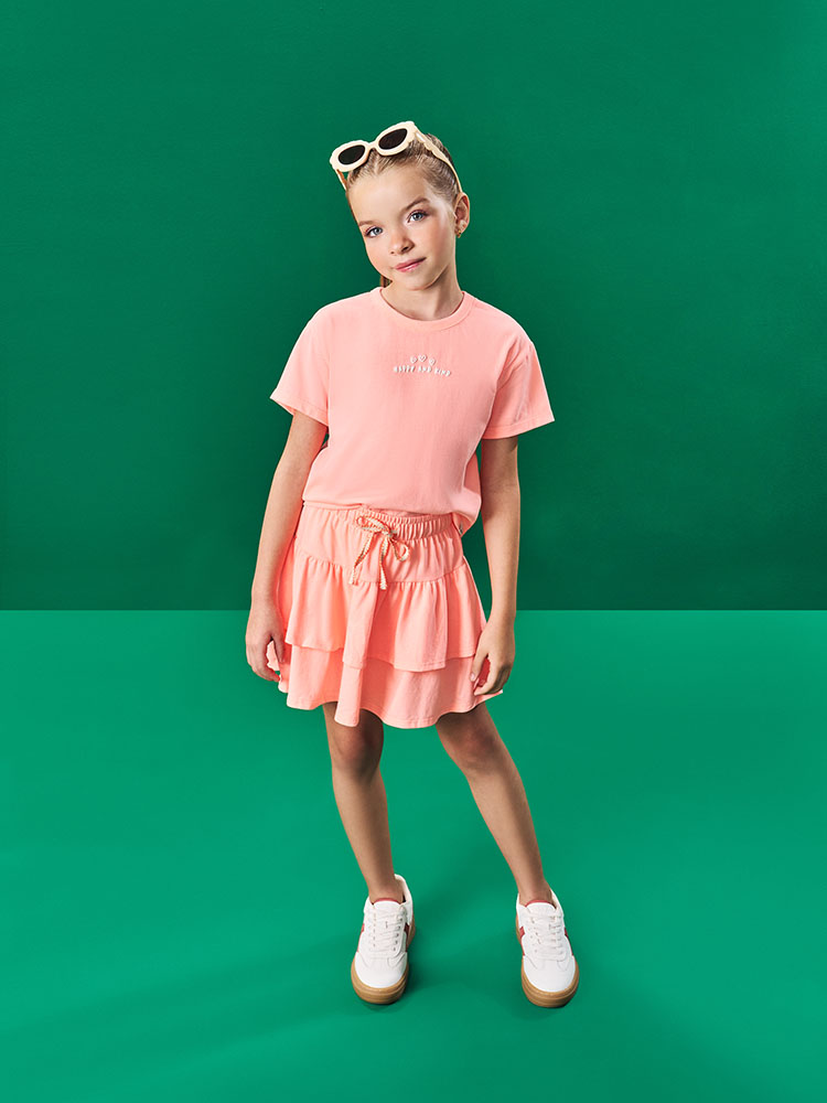 A saia com babados e cós ajustável oferece ótimo caimento e liberdade de movimento.