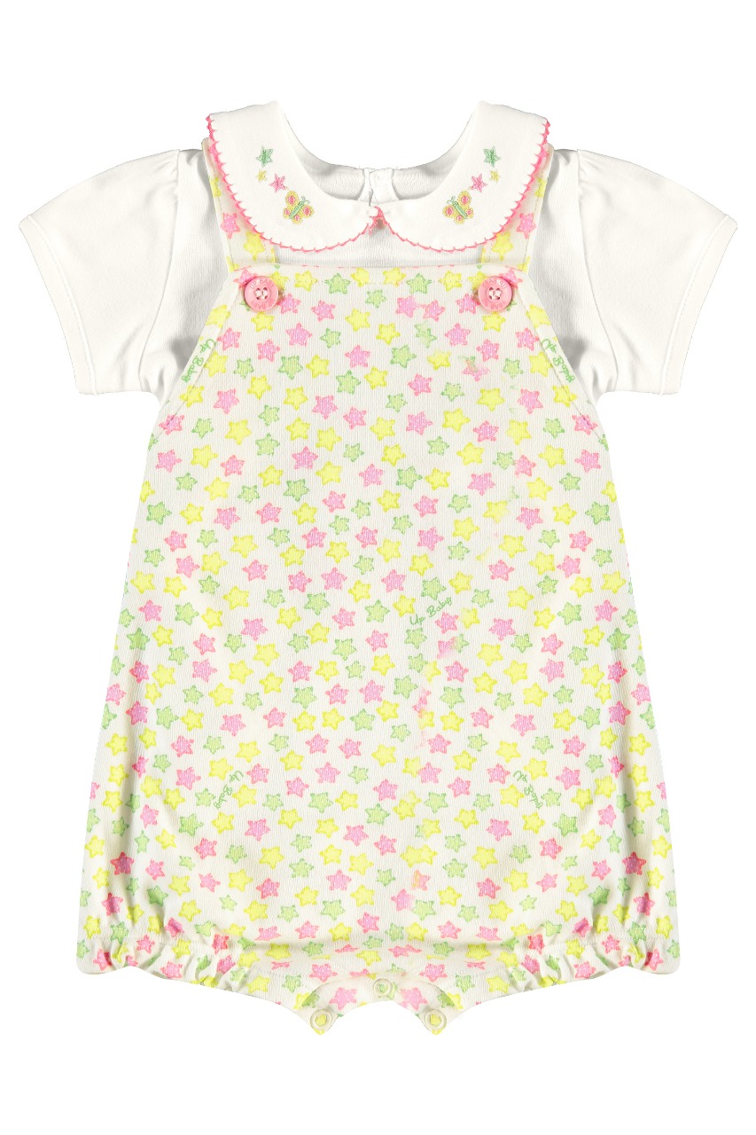 Macacão curto infantil com visual delicado e criativo, que simula uma sobreposição de camiseta com jardineira 🌼. Combina o conforto de um macacão com a elegância de uma sobreposição: a parte superior lembra uma blusinha off white clássica, enquanto a parte estampada imita uma jardineira, criando um look divertido, estiloso e prático para o dia a dia.