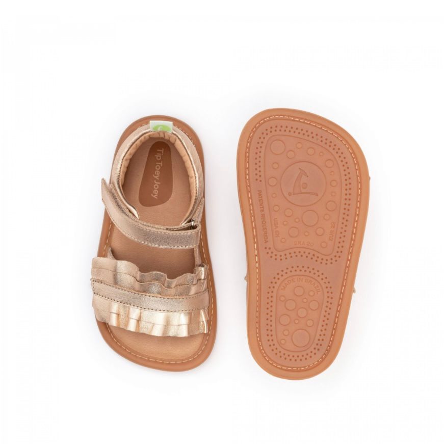 A sandália Ruffy para os primeiros passos tem calcanhar fechadinho mas sua tira com detalhe de babados