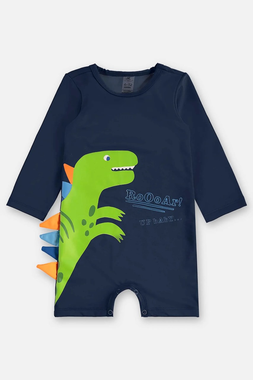 Com manga longa e aplicação divertida de dinossauro, o modelo traz charme e descontração. A abertura entrepernas com botões de pressão facilita a troca de fraldas, enquanto o tecido macio e elástico proporciona liberdade total de movimento.