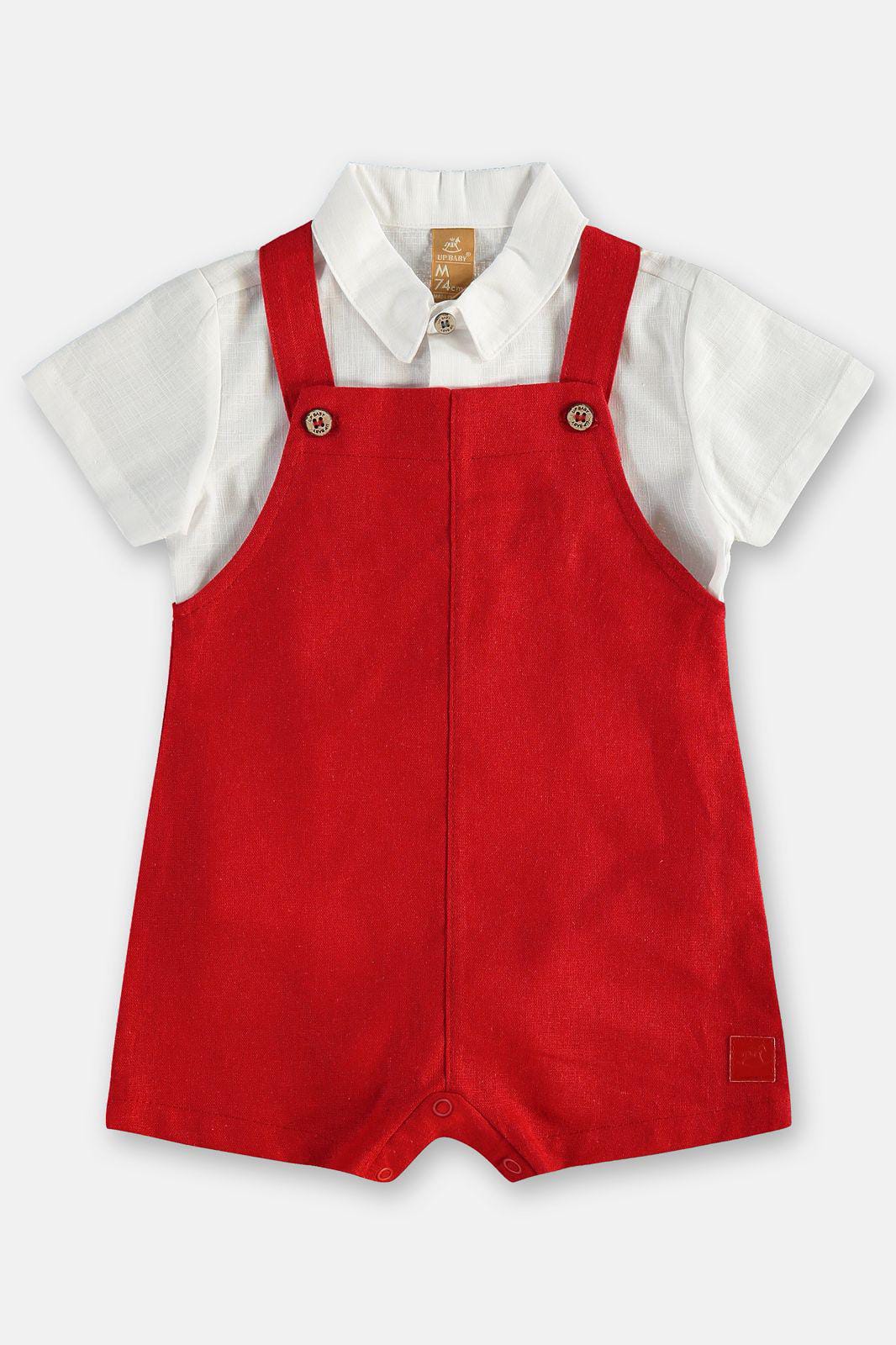O body, em tecido leve e respirável, possui gola social, fechamento frontal com botões de pressão e abertura entre as pernas, facilitando o vestir e as trocas. Já a jardineira, em tom vermelho vibrante, conta com alças ajustáveis que garantem ótimo caimento e ainda mais praticidade no dia a dia.