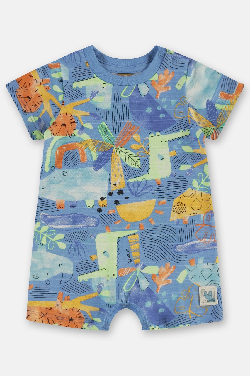 A estampa vibrante e cheia de vida traz desenhos lúdicos de animais e elementos da natureza, despertando a imaginação dos pequenos. O design prático conta com botões de pressão no ombro, além de acabamento confortável no decote e nas pernas, tornando a hora de vestir mais fácil e prática.