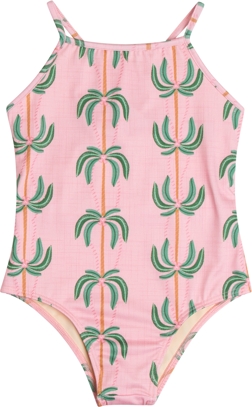 Maiô com estampa de coqueiros verdes e detalhes em formato de coração.