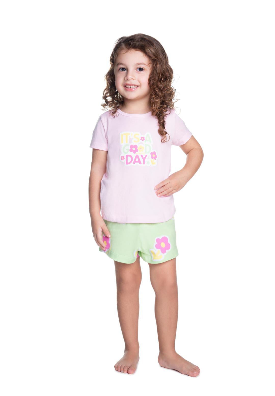 Pijama leve e macio, com blusa estampada “It’s a Good Day” e short verde-claro com flores.