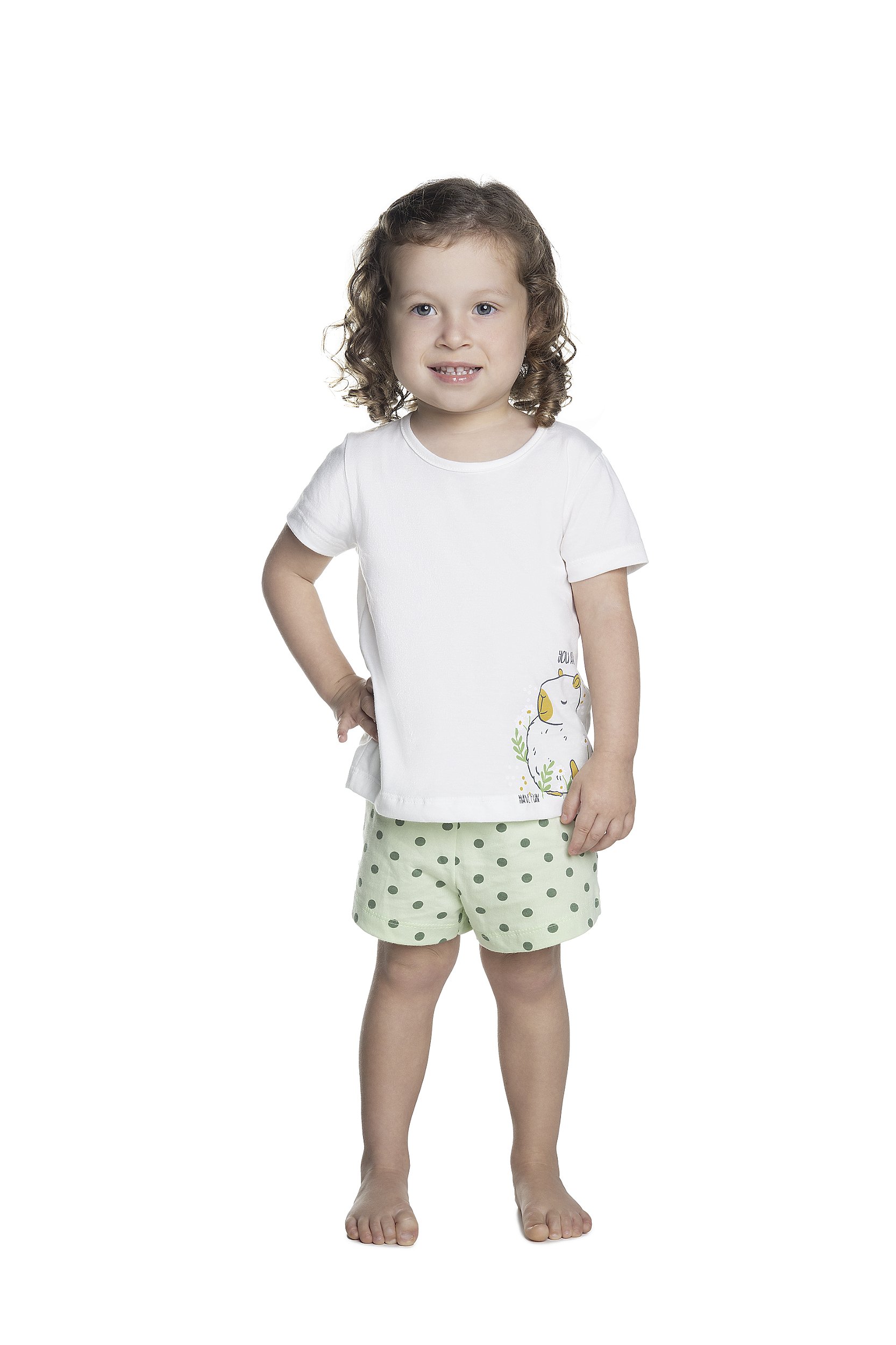 Conjunto composto por uma estampa divertida de capivara, shorts com bolinhas colorida .