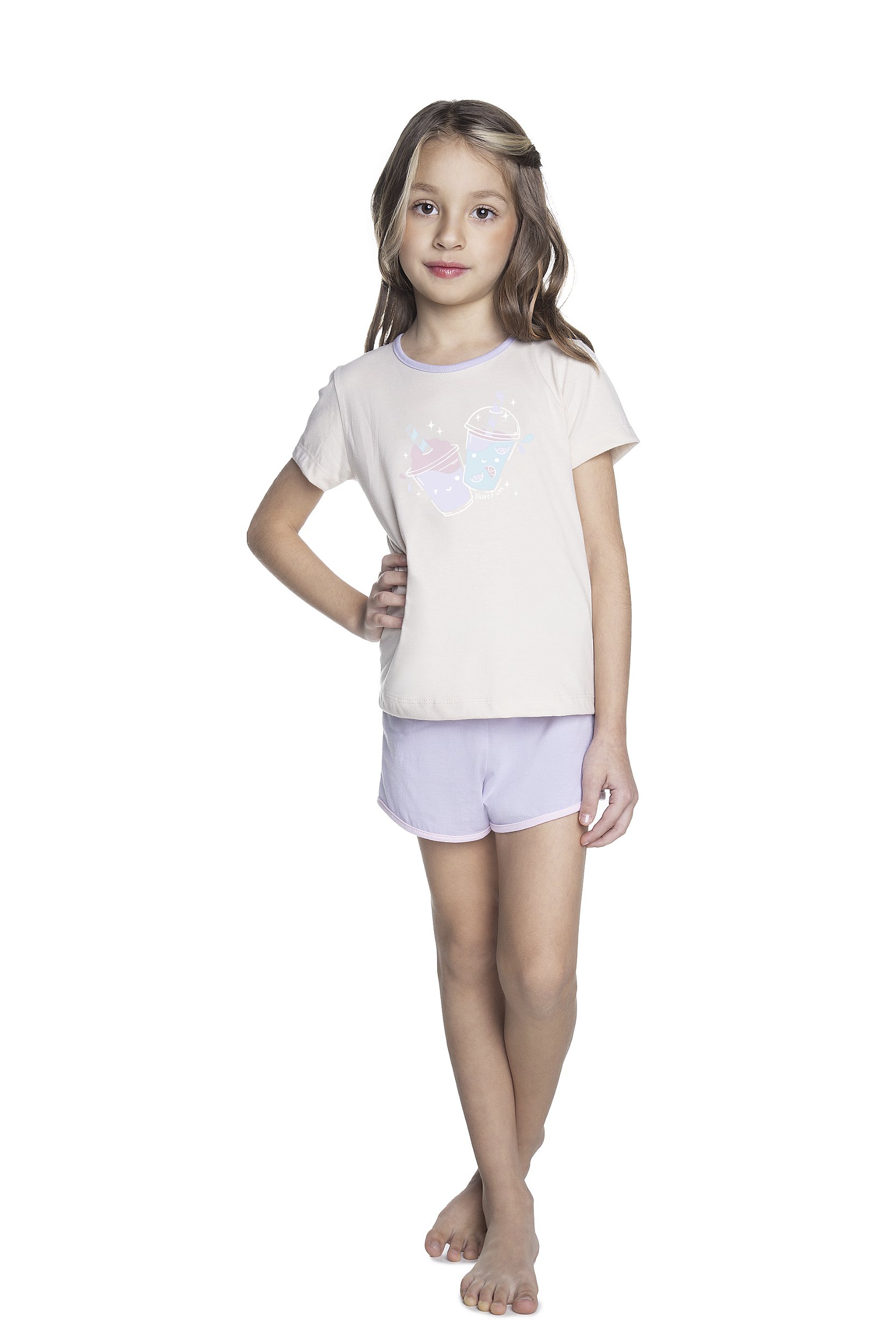 O pijama vem com camiseta bege clara estampada com copinhos coloridos que ganham um toque mágico ao brilham suavemente no escuro e e um short lilas com acabamento em vies rosa, superdelicado.
